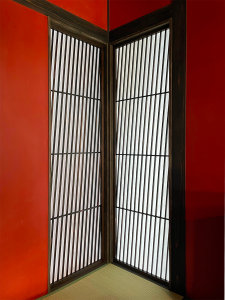 斜めにデザインされた少し変わった障子。古民家宿の一角に納めました。
