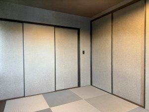 花柄の襖紙が特徴的な和室の収納扉。襖紙を巻き込んで貼り、繊細なデザインが部屋にアクセントを与えています。