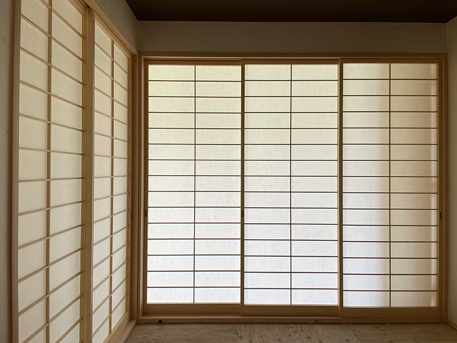 シンプルで均整のとれた障子が美しい空間を演出。自然光を柔らかく取り入れ、和の趣と調和した静かな雰囲気を生み出します。