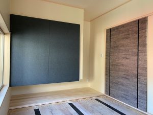 和紙を巻き込んで仕上げた和室の収納扉。深い緑色が和の空間に落ち着きと上品さを添えています。