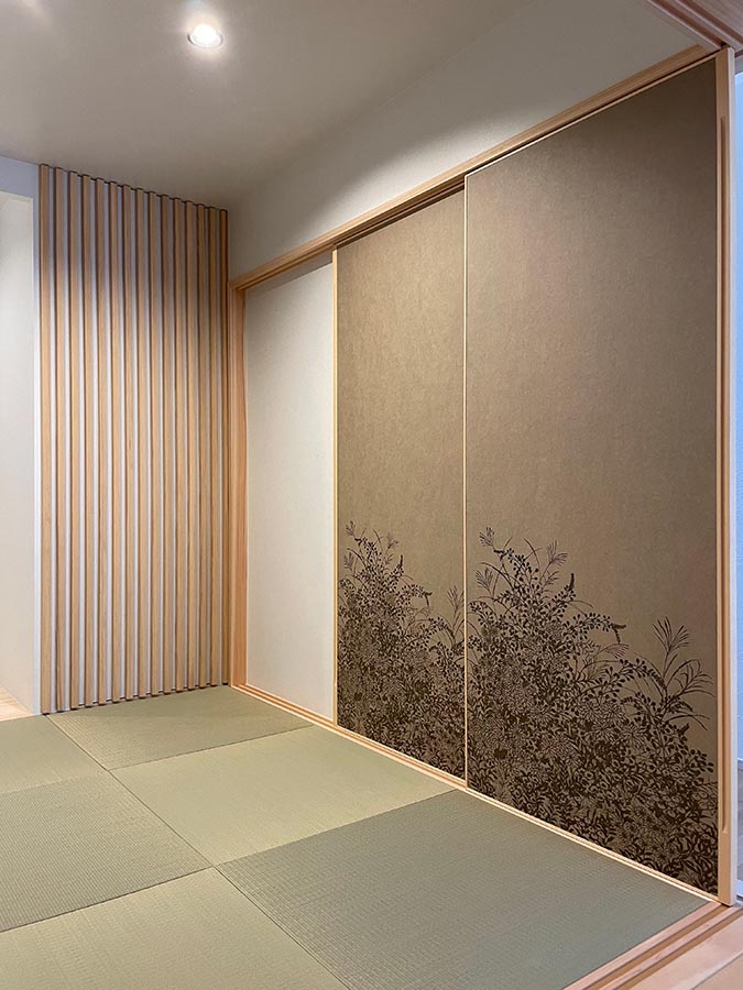 淡い色合いの襖紙で優しい印象に